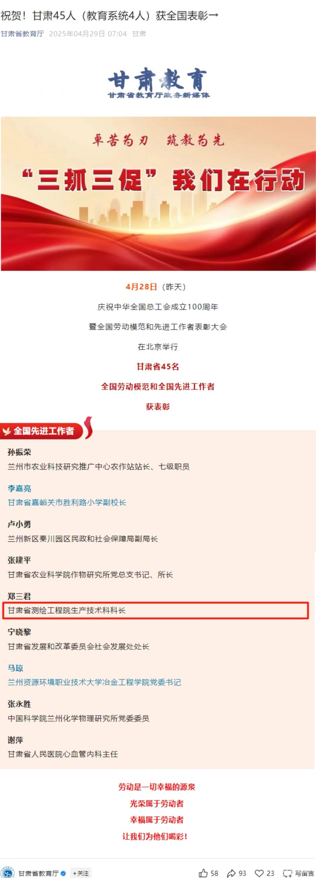 4月28日,庆祝中华全国总工会成立100周年暨全国劳动模范和先进工作者表彰大会在北京举行。本次大会中,甘肃省45名全国劳动模范和全国先进工作者获表彰,我校优秀校友郑三君位列其中。
