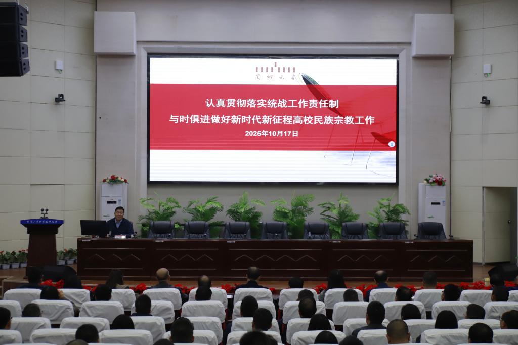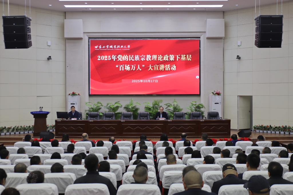 为深入推动中央及省委关于民族宗教工作的决策部署落地见效,按照省委统战部、省教育厅工作部署,10月17日,2025年党的民族宗教理论政策下基层“百场万人”大宣讲活动在甘肃工业职业技术大学举行。活动特邀兰州大学党委统战部副部长王兴东作主题宣讲,我校党委常委、副校长、党委统战部部长周晓明主持。党委统战部、党委学生工作部等职能部门中层干部、思政课教师、专兼职辅导员及部分学生骨干300余人参加。