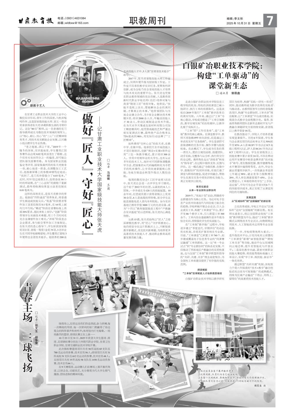 在甘肃工业职业技术大学的工业中心数控实训车间,常年工作到深夜,与机床嗡鸣作伴,这是国家级技能大师、省五一劳动奖章获得者张天虎15载职教生涯的寻常印记。这位“80 后”教师,从一名普通的实习指导教师成长为数控技术领域的领军人,以“细心、耐心、恒心”的“三心”工匠精神培育英才,用技术攻关赋能企业发展,以兴趣小组点燃学生专业热情。