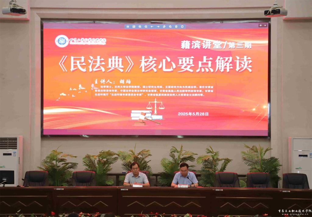 为全面贯彻落实党的二十大精神,深入学习宣传贯彻习近平法治思想,落实省委宣传部、省司法厅关于法治宣传教育的工作要求,5月28日下午,学校2025年藉滨讲堂第三期在图书馆五楼智敏报告厅开讲。兰州大学法学院教授、法学博士胡珀应邀作《民法典》宣讲专题报告。学校各二级学院团总支书记、辅导员及学生代表共计300余人现场聆听报告。宣讲会由党委副书记文云主持。