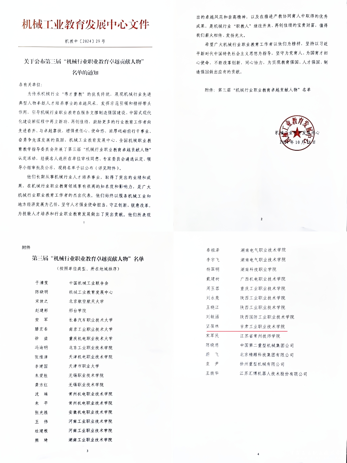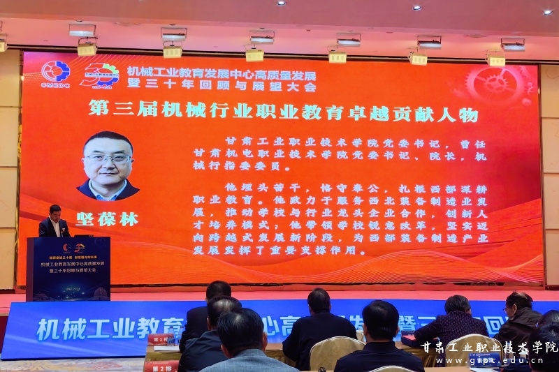 我校党委书记坚葆林从教36年以来,勤勉敬业,无私奉献,扎根西部深耕职业教育,致力于服务西北装备制造业发展。他勇于开拓创新,着力于探索实践产教融合新路径,推动学校与行业龙头企业合作,创新人才培养模式,促进人才培养质量不断提升。他坚持锐意改革,不断创新体制机制,积极推进学校内涵式发展,学校实力和影响力明显提升,为西部装备制造产业发展发挥了重要人才支撑作用,为机械行业职业教育发展作出了突出贡献。