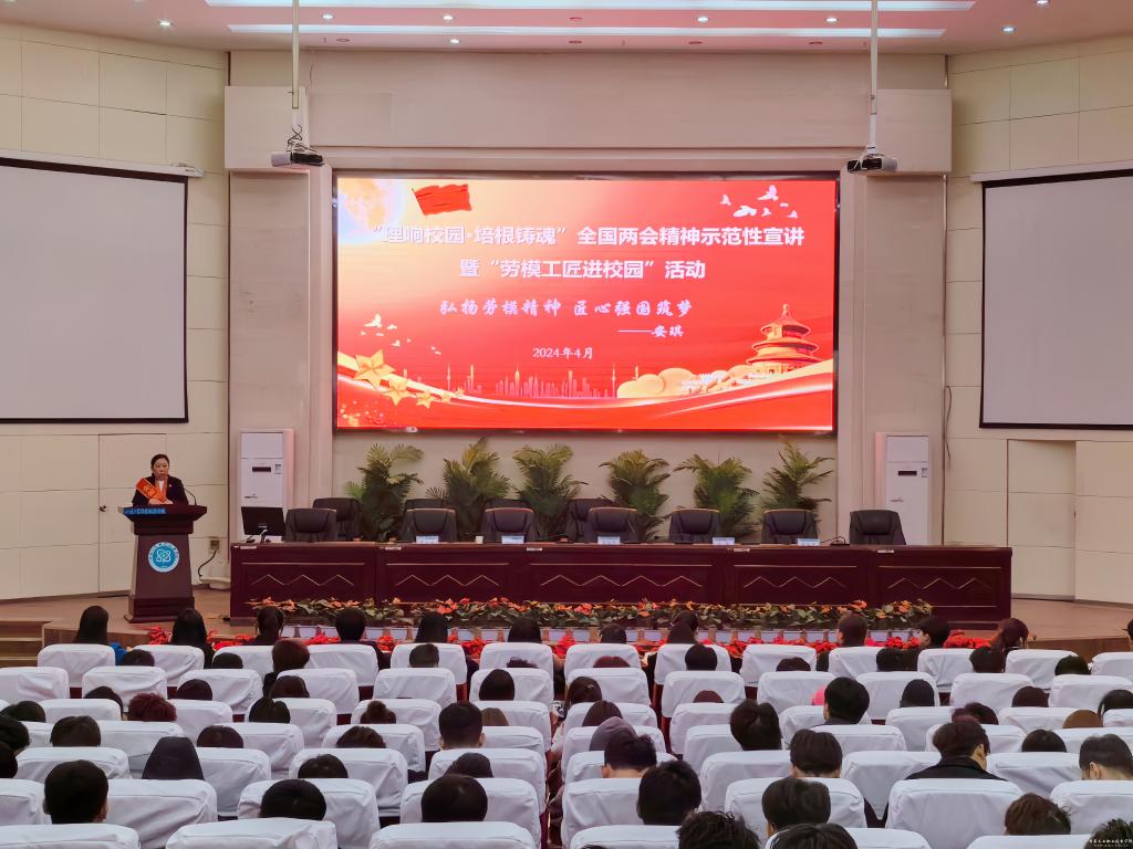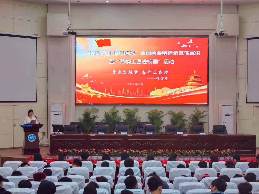 为全面深入学习领会习近平总书记在全国两会期间发表的一系列重要讲话精神以及全国两会审议通过的报告和文件精神,根据省委教育工委、省总工会统一安排,4月24日上午,学校在图书馆智敏学术报告厅举办了“理响校园·培根铸魂”全国两会精神示范性宣讲暨“劳模工匠进校园”活动。党委委员、副院长周晓明出席,校工会、马克思主义学院党总支主要负责人、马克思主义学院教师、“1231”工程学生和各二级学院学生干部及学生代表,共计300余人参加。活动由党委委员、宣传(统战)部部长黄晓慧主持。