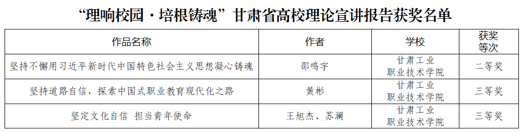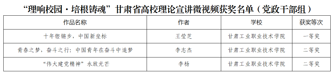 此次获奖充分体现了我校宣传思想工作取得的良好成效,为进一步落实立德树人根本任务、推动学校思想政治工作奠定了良好基础,为实现学校各项事业稳步发展营造了良好氛围。学校将以此为契机,扎实开展理论宣讲活动,持续掀起理论学习热潮,积极打造具有甘肃特色、甘工院特色的理论宣讲品牌,努力提升思政育人功能,为学校高质量发展奠定良好的思想文化基础。