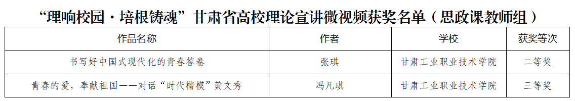 为深入学习贯彻习近平新时代中国特色社会主义思想和党的二十大精神,坚持不懈用党的创新理论铸魂育人,大力培养干部师生理论宣讲骨干,打造富有甘肃教育特色的宣讲品牌,着力培养堪当民族复兴大任的时代新人,9月至11月,省委宣传部、省委教育工委、团省委举办了“理响校园·培根铸魂”全省高校理论宣讲作品征集评选展示活动。经过专家组的严格评审,近期,省委教育工委公布了评审结果,我校共计15部作品获奖,分别荣获一等奖1项,二等奖8项,三等奖6项。