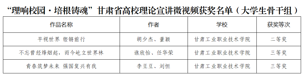 理论宣讲报告作品中,邵鸣宇的作品《坚持不懈用习近平新时代中国特色社会主义思想凝心铸魂》荣获二等奖,黄彬的作品《坚持道路自信,探索中国式职业教育现代化之路》,王旭杰、苏澜的作品《坚定文化自信 担当青年使命》荣获三等奖。理论宣讲微视频作品中,王莹芝的作品《十年铿锵步,中国新坐标》荣获党政干部组一等奖,李志杰的作品《青春之梦,奋斗之行:中国青年在奋斗中追梦》、李杨的作品《“伟大建党精神”永放光芒》分别荣获党政干部组二等奖;张琪的作品《书写好中国式现代化的青春答卷》荣获思政课教师组二等奖,冯凡琪的作品《青春的爱,奉献祖国——对话“时代楷模”黄文秀》荣获思政课教师组三等奖;杨博霞、宋志国的作品《红色基因映初心 半条棉被暖人心》荣获辅导员组二等奖,夏金祥、王启瑞、顿学斌的作品《担当时代使命 争做时代新人》荣获辅导员组三等奖;柳媛的作品《不忘初心、牢记使命》,柳岩溪的作品《青年向上 国家向前——航天英雄桂海潮的“追星”之路》分别荣获团学干部组二等奖;胡少杰、董颖的作品《平视世界 铿锵前行》荣获大学生骨干组二等奖;谯欣怡、任华荣的作品《不忘曾经烽烟起,而今屹立世界林》,李豆豆、刘恒的作品《青春筑梦未来 强国复兴有我》分别荣获大学生骨干组三等奖。