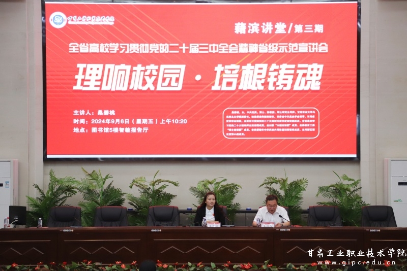 为了全面深入学习宣传贯彻党的二十届三中全会精神,按照省委教育工委统一安排部署,9月6日上午,“理响校园·培根铸魂”全省高校学习贯彻党的二十届三中全会精神省级示范宣讲活动暨学校“藉滨讲堂”第三期在图书馆五楼智敏报告厅举行。省委教育工委宣讲团成员、甘肃农业大学马克思主义学院副院长桑碧桃为我校师生作题为《坚定不移持续深化改革——学习宣传贯彻党的二十届三中全会精神》专题宣讲报告。宣讲会由党委副书记文云主持,党委宣传部、马克思主义学院、团委、二级学院师生代表300余人参加。